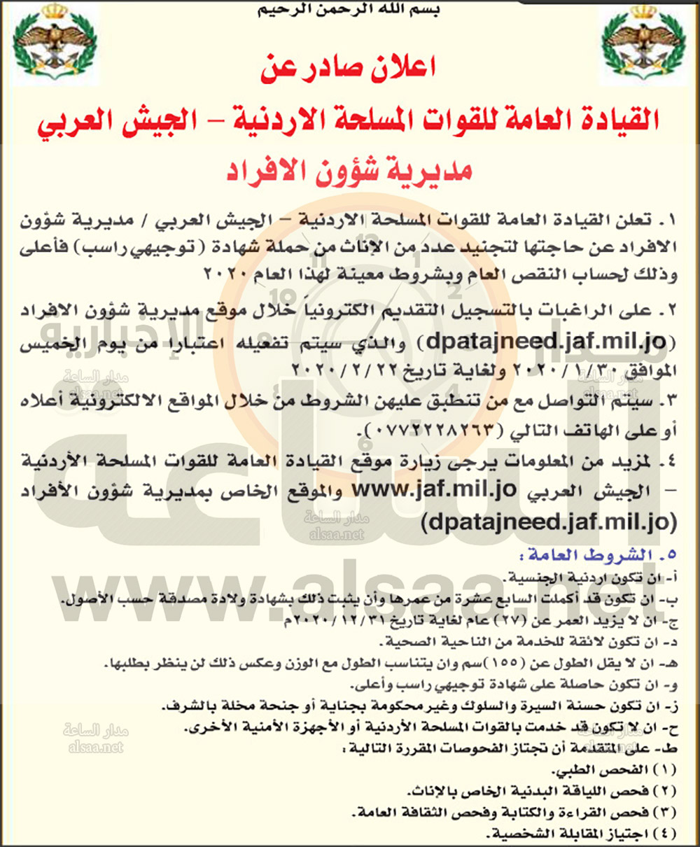 اعلان صادر عن القوات المسلحة الاردنية الجيش العربي تجنيد حصاد الأخبار