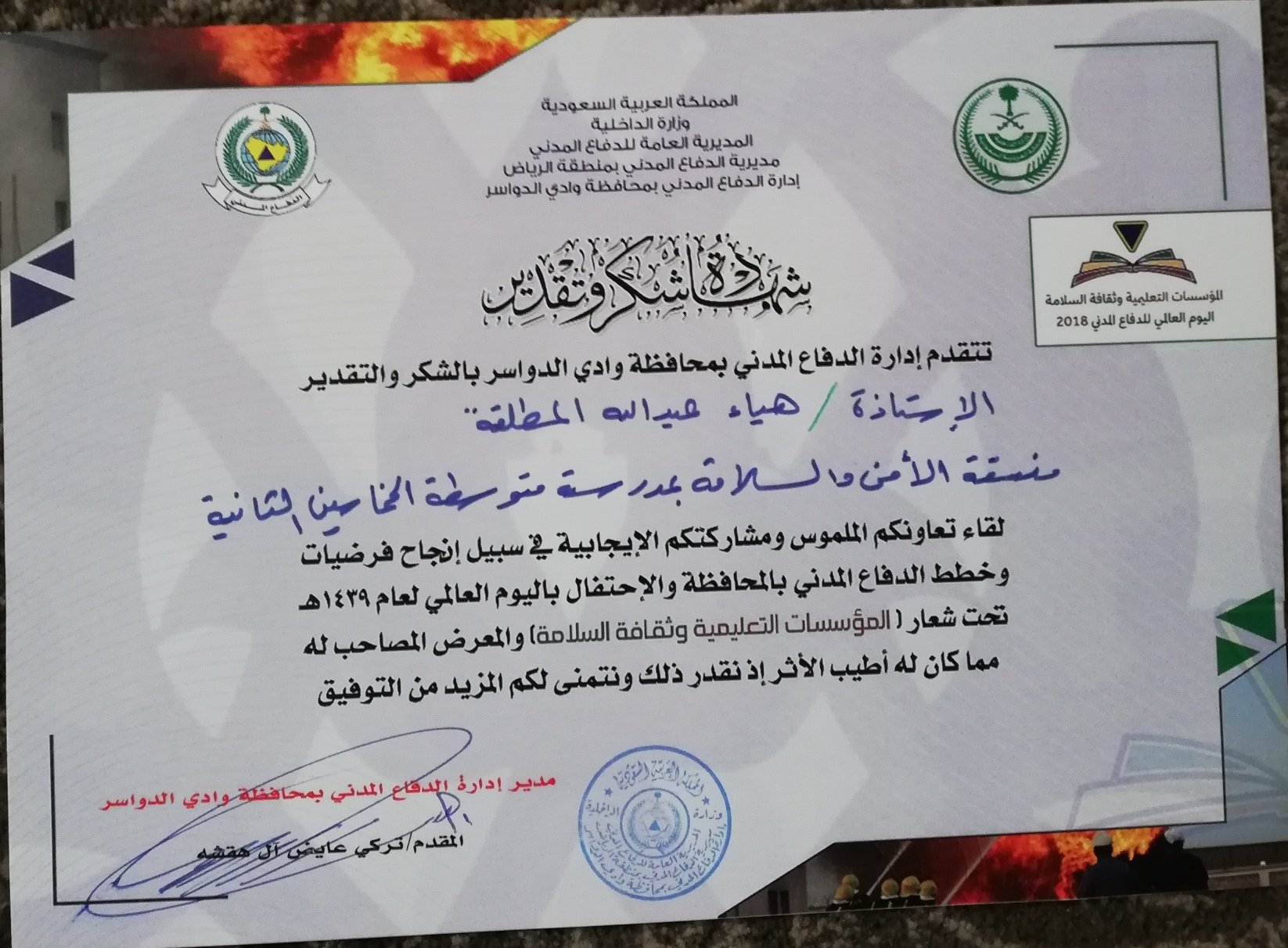 حياتي مهمة A Twitter مدير الدفاع المدني يثمن جهود كل من قائدة متوسطة الخماسين الثانية الأستاذة مزنة آل مطلقة والأستاذة هياء آل مطلقة منسقة الأمن والسلامة بشهادتي شكر وتقدير على دوريهما البارزين